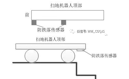 防跌落传感器也是利用超声波进行测距。当扫地机器人行进至台阶边缘时,防跌落传感器利用超声波测得扫地机器人与地面之间的距离,当超过限定值时,向控制器发送信号,控制器控制扫地机器人进行转向,改变扫地机器人前进方向,从而实现防止跌落的目的。扫地机器人防止跌落示意图如图所示。