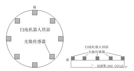 床底、沙发底、柜子底等地方相对较脏,因此这些地方需要重点清扫,以保证清洁度。为实现此功能,在扫地机器人正面安装8个光敏传感器。