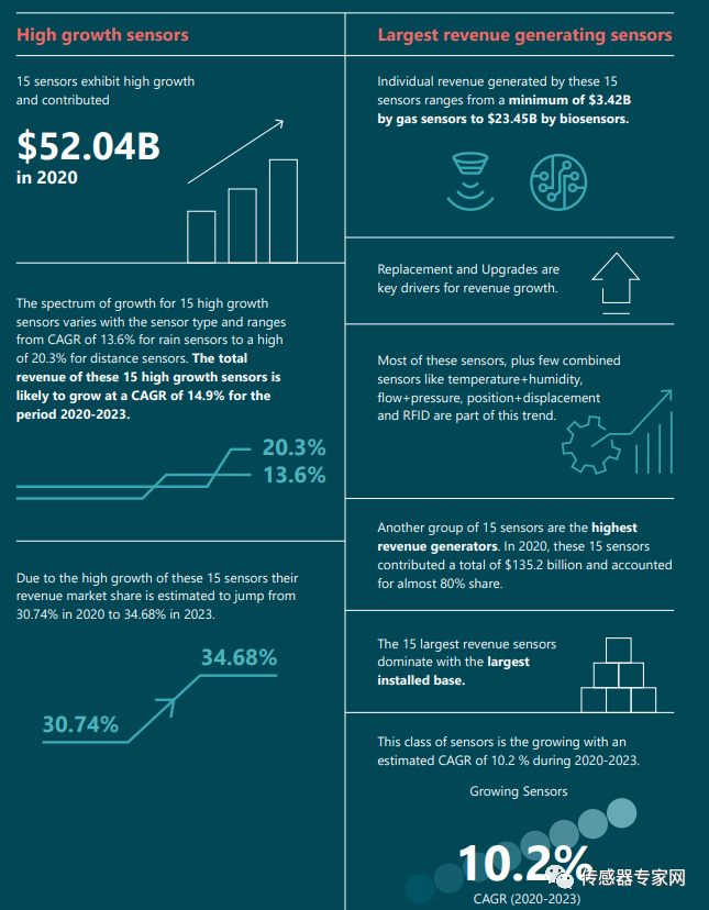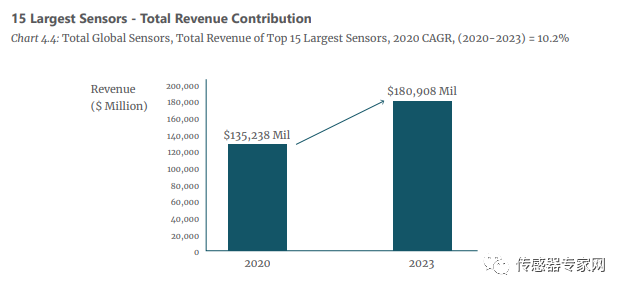 15种规模最大的传感器是传感器市场销售额的主要贡献者,在2020年产生1350亿美元销售,预计到2023年将增加到1800亿美元。
