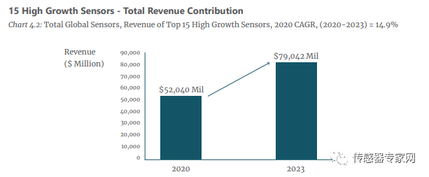 预测到2023年,得益于这15种传感器的高增长性,15种高增长传感器营收将达到790亿美元,占比约34%。