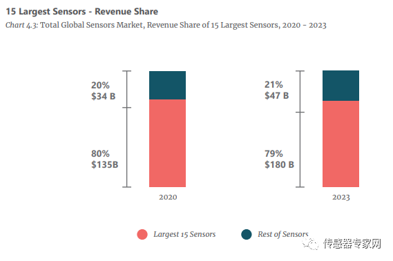 预测到2023年,得益于15种规模最大的传感器的营收将达到1800亿美元,占比约79%。