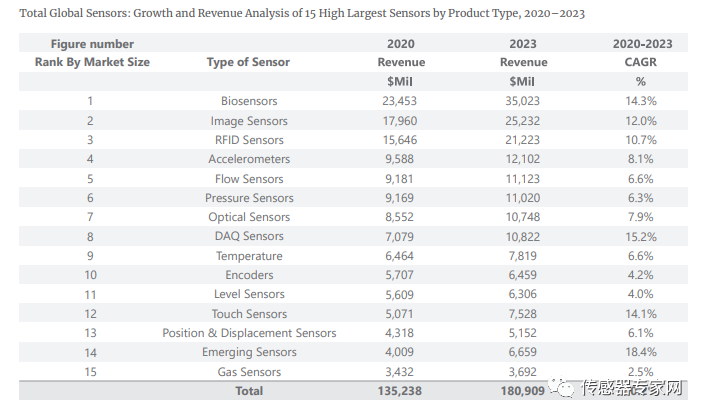下表是15种高增长传感器2020年销售额和2023年预测销售额情况