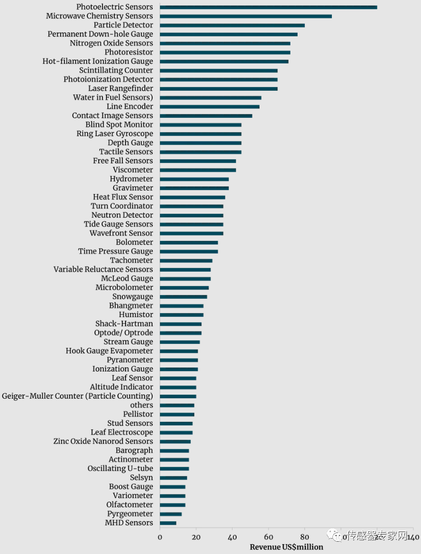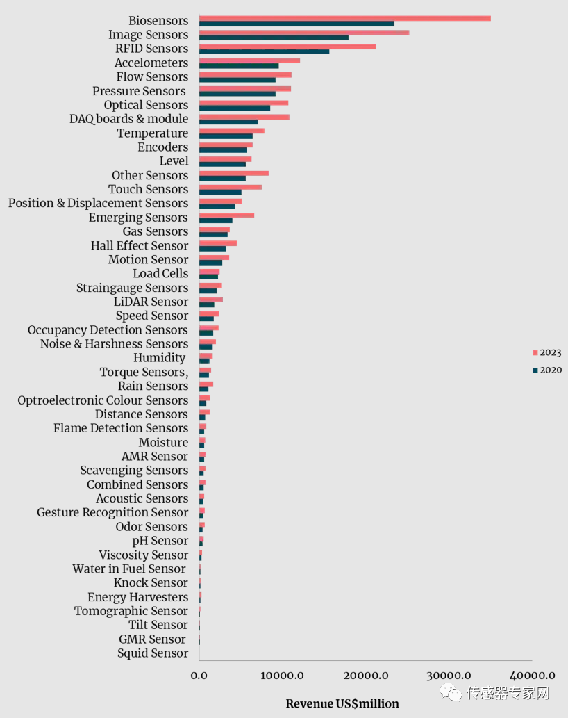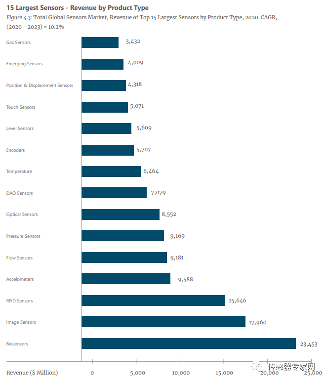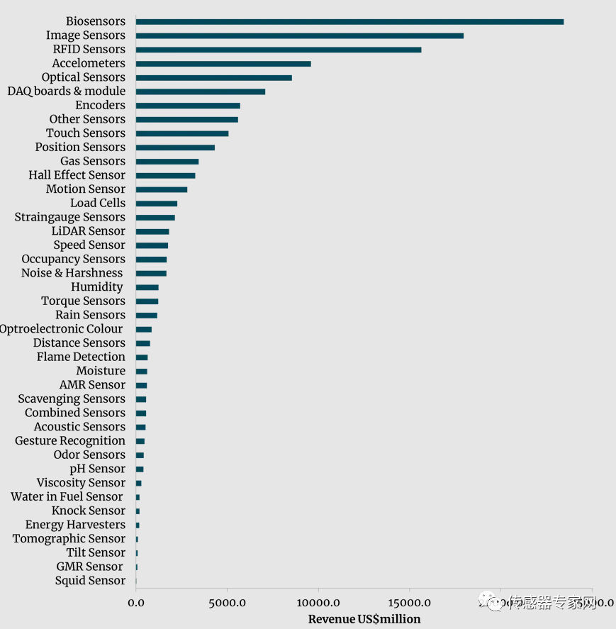 这15种传感器产生的营收,从最低的气体传感器34.2亿美元,到生物传感器234.5亿美元不等。