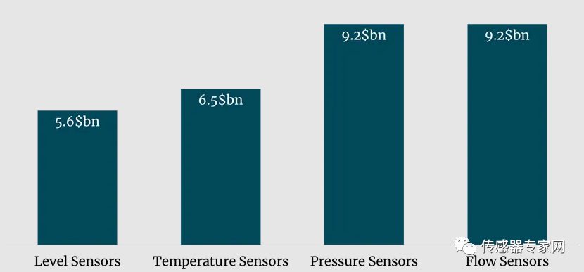 基本传感器主要测量四个最广泛的物理量,如压力、温度、流量和液位,这些参数占总收入的 18%,到 2020 年达到 304 亿美元。技术发展带来的升级和更换是收入和收入增长的主要驱动力。2020 年,受 COVID 影响,压力、流量和液位传感器的收入增长下降了近一半。到 2020 年,只有温度传感器能够将年增长率的下降幅度限制在 6.2%。