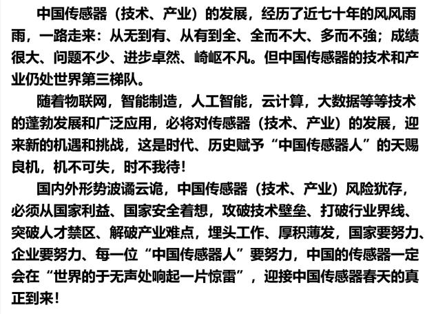 中国传感器的发展走过了一段极不平坦之路:从无到有,从有到全,全而不強,机遇很多。对传感器的认识上下基本趋于一致,转变了“造船不如买船、买船不如租船”的思维模式,从“市场换技术”的迷雾中走出,正确理解“科技创新的主体在企业”这一观点。经过几代传感器人的努力,风雨同舟,一路艰辛,成绩巨大,业绩卓然,问题不少,前景光明。