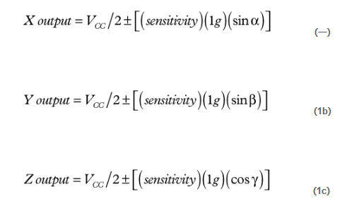 在图 2(a) 中,物体以广义的任意方向描绘;它的边缘相对于 X 轴形成α角;β,相对于Y轴;和γ,相对于 Z 轴。在零g加速度下,每个轴传感器的电压输出为V抄送/2.因此,三个轴的输出将是: