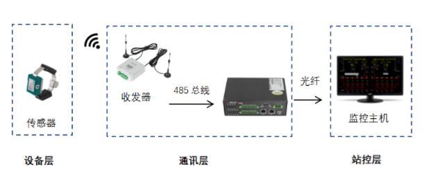 无线测温传感器ATE100M安装于风机,电机,齿轮机座的外壳处,将采集到的温度量通过无线方式传输至测温收发器,再经RS485通讯线传输至网关,然后通过光纤将数据传输至Acrel-3000WEB电力监测平台。