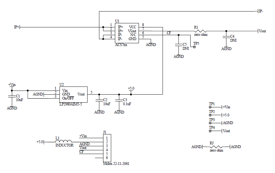 由于ACS712采用单电源5V供电,本感测系统电源采用LP2980AIM5-5低压降稳压器,这是一款具有使能功能的5V固定电压输出的低压LDO。LP2980输出电压精度可达±0.5%(A级),休眠时电流不超过1μA,外围电路非常简单,只需在稳压输出引脚接上一个1μF电容器即可。