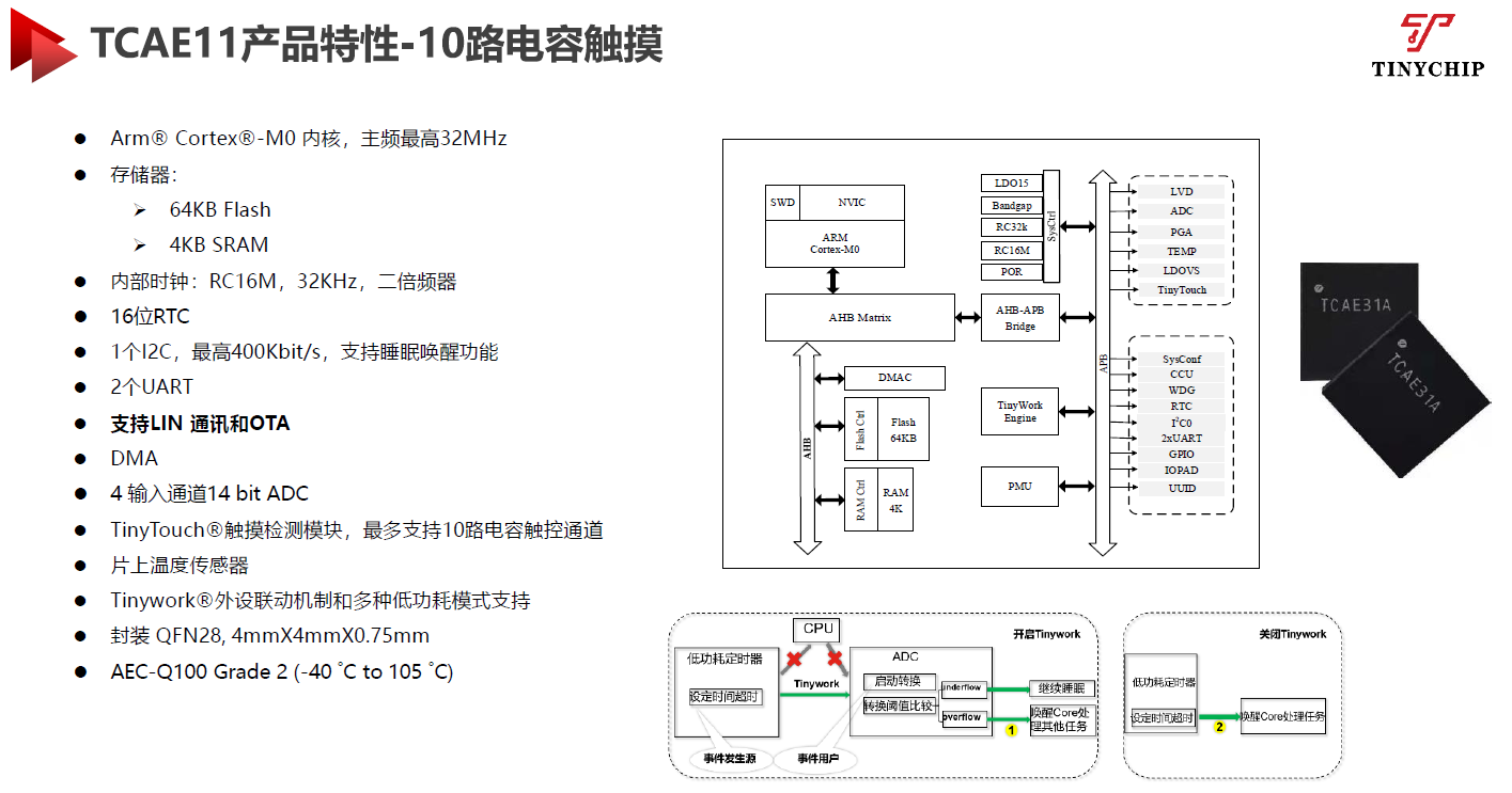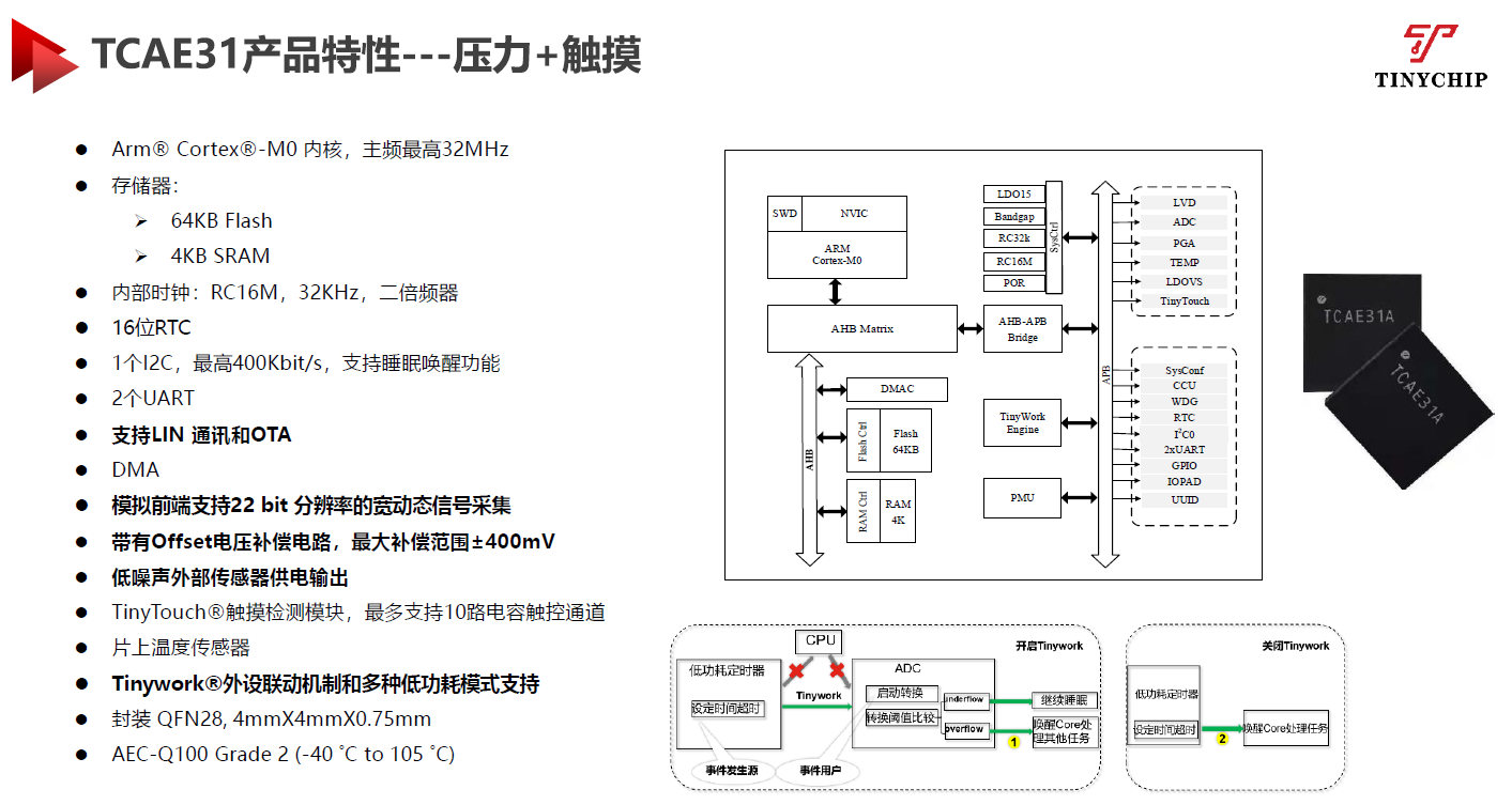 在具体产品特性方面,TCAE31基于Arm Cortex-M0内核,主频最高32MHz、存储器为64KB Flash和4KB SRAM、支持LIN通讯和OTA、模拟前端支持22bit分辨率的宽动态信号采集、带有Offset电压补偿电路、具有低噪声外部传感器供电输出,以及通过了AEC-Q100 Grade2标准认证。