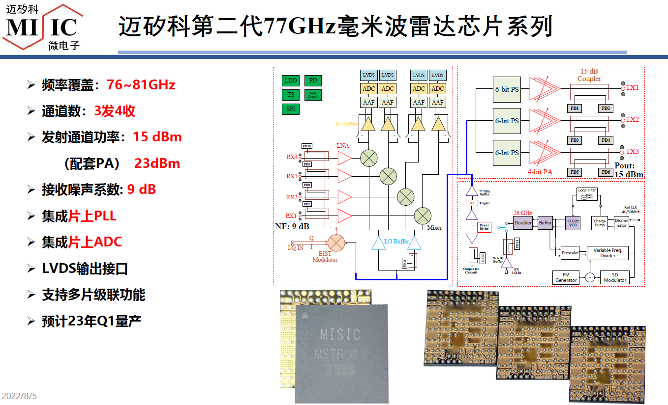 据南京迈矽科微电子科技有限公司总经理侯德彬介绍,MSTR003是其第二代77GHz毫米波雷达芯片系列,频率覆盖范围为76~81GHz、通道数为3发4收、发射通道功率15dBm(使用配套PA的话,可达23dBm)、接收噪声系数为9dB,同时还集成了片上锁相环(PLL)、片上ADC、支持多片级联功能。配合迈矽科微电子自己研发的功率放大器和低噪声放大器套片,3片级联方案的交通雷达可以达到业界最高的1公里以上的探测距离;2到4片级联的车用4D成像雷达也可以获得300米以上的探测距离。“该芯片预计今年底明年初量产。”他透露说。