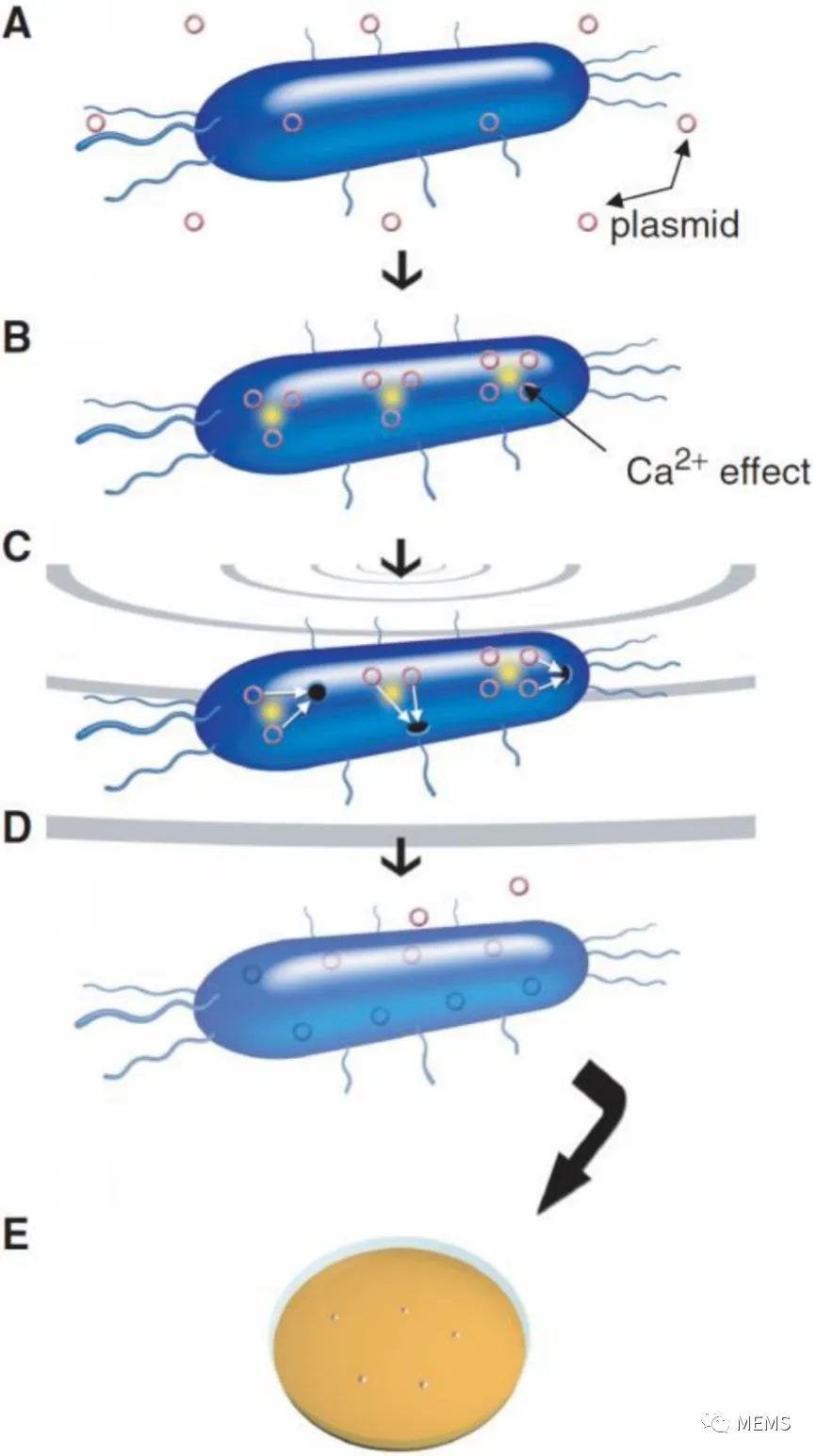 超声介导的基因转移,也被称为声孔效应,是近年来开发的一种细胞膜渗透技术,已被应用于细胞内的DNA和药物转移。该技术基于超声波的空化效应。当超声波在液体溶液中传播时,路径中的液体将经历交替压缩和膨胀。如果超声强度足够大,液体在压缩和膨胀过程中会形成气泡,并能在膨胀到一定程度后破裂。从气泡产生到破裂的时间通常非常短,通常在1μs以内。该过程被称为超声空化。超声空化产生的局部高温高压冲击波可以在细胞膜上形成有效直径小于100nm的微孔。这些微孔可以持续几秒钟,让较大的分子从培养基进入细胞。在优化的条件下,细胞可以在空化效应下存活,且无明显损伤。基于自修复机理,基因转染后细胞膜可以自行桥接。以上是超声介导的基因转移的原理。图1显示了超声介导的DNA转移机理和DNA质粒转移到细菌细胞内的典型步骤。