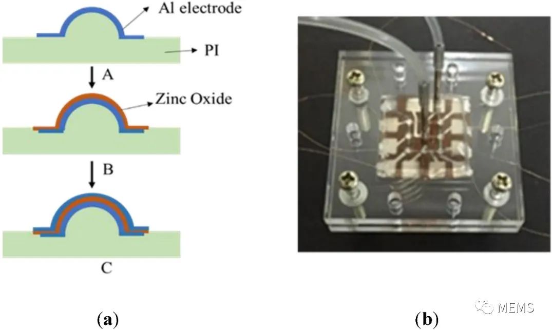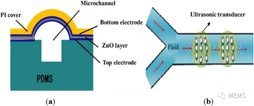 图3(a)PI基底上自聚焦超声换能器阵列的制备流程图;(b)微流控转染生物芯片。