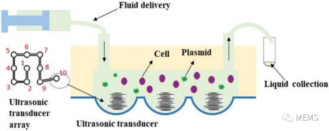 现有的超声介导的基因转移技术都是在宏观体积下使用大型超声设备(例如喇叭形超声辐射器或超声浴)进行的。相关研究仅在宏观尺度(10⁵–10⁷个细胞)上进行,并得出平均数据。由于细胞反应的不均匀性和不同的生命或代谢周期,平均数据往往难以解读。为了解决这个问题,需要开发单细胞操作、高精度分析和高灵敏度检测的新技术和新装置。有趣的是,利用微流控技术,生物芯片——“芯片实验室”(lab-on-a-chip)的尺寸与细胞尺寸是兼容的,适合单细胞操作。