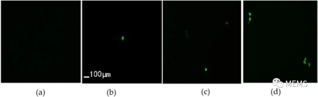 图5 HeLa细胞中绿色荧光蛋白表达结果(×200):(a)仅添加质粒;(b)添加质粒并用2 号换能器超声处理20s;(c)添加质粒并用4号换能器超声处理20s;(d)添加质粒并用2号和4号换能器同时超声处理20s。
