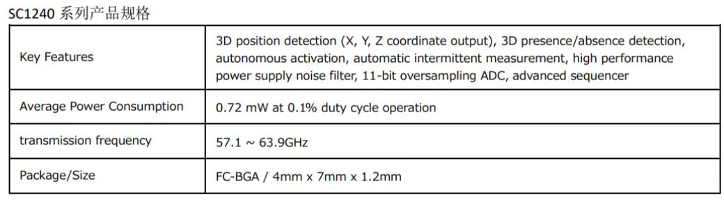在产品性能方面,SC1240系列产品具有高度集成的特点,内置有天线、无线电路、A/D转换器、FIFO内存、SPI或I2C接口、可灵活地改变工作周期并控制功耗的高功能定序器,以及高性能测距测角度信号处理电路、自动启动等功能,无需高频及信号处理相关专业技术,便能轻松地获取并使用3D位置信息,可适用于多人检测、非接触手势操作等。未来我们将根据客户需求,以SC1240AR3为中心开发更多新产品。