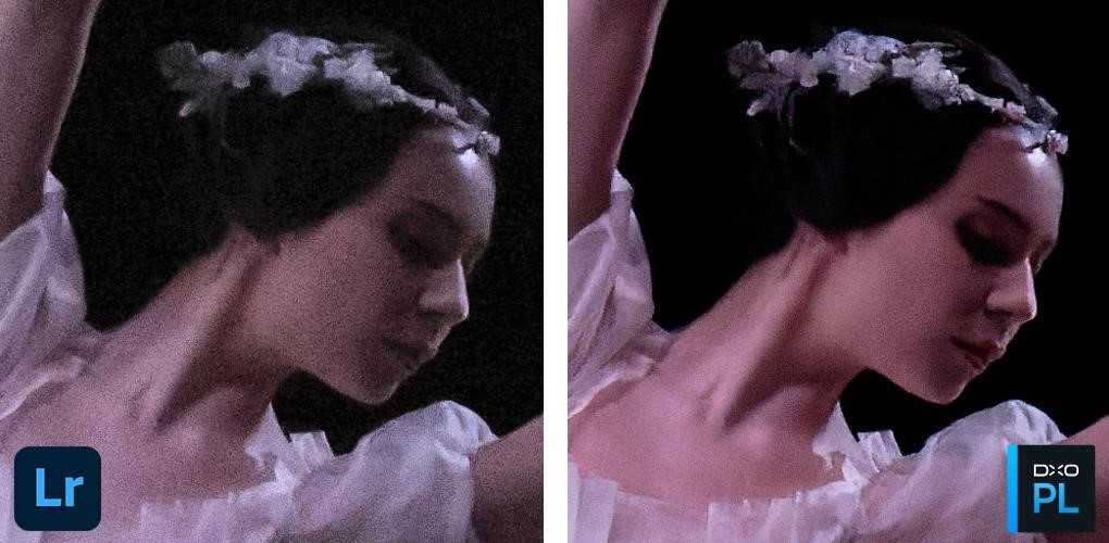 这张低光室内动态照片是使用富士 X-T3 在 ISO 6400 下拍摄的。 原始照片曝光不足,因此我们在后期处理过程中将其推高了两档 — 相当于 ISO 25600(上图)。 JPEG 图像上无法进行如此大幅度的曝光调整,因此这里不是与相机进行比较,而是与一款著名的 raw 转换器——具有“增强细节”功能的 Adobe Lightroom(左下角)进行比较。 当我们放大人脸观察时,可以看到 DxO DeepPRIME(右下,使用 DxO PhotoLab)的图像明显更为清晰。 因为 DeepPRIME 使用神经网络同时运行去马赛克和降噪,在降噪方面表现更佳,同时在亮度和颜色方面保留了更多细节。