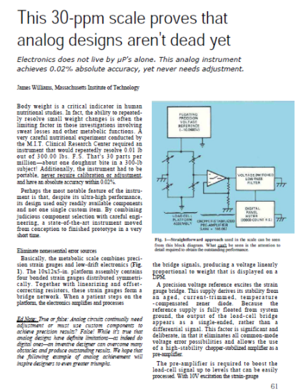 图 1 Jim Williams关于高精度、超稳定称重秤的设计和误差最小化的EDN文章的第一页清楚地表明,它实现了 30 ppm 绝对精度 (0.02%) 的性能,并且无需在场地。