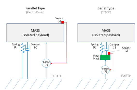 图 2光学平台的主动振动控制系统使用并联或串联的支撑弹簧和消除致动器来衰减由静态隔离装置消除的较大振动的残余。资料来源:TMC/AMETEK Ultra Precision Technologies