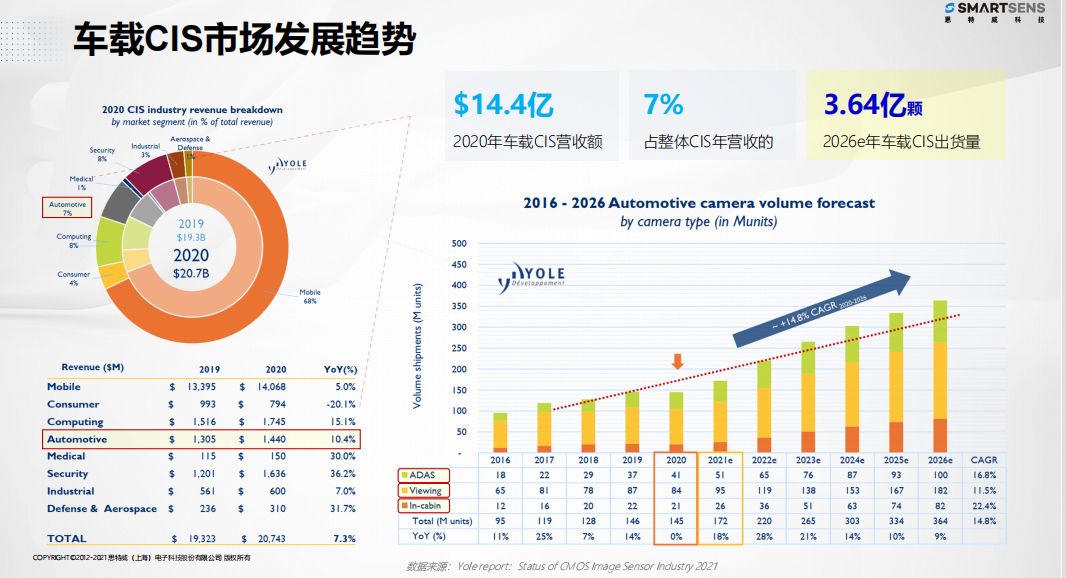 据YOLE的预测,车载CIS到2026年市场预估年出货量可以达到3.64亿颗,占CIS市场年营收的7%。思特威自研车规CIS可以为中国汽车智能化赋能。