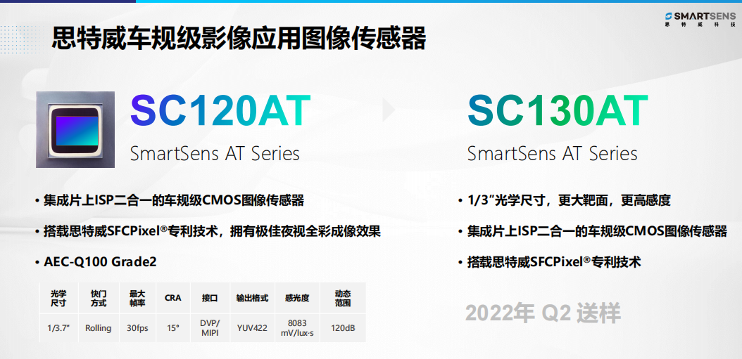 集成了ISP的二合一车规级CMOS传感器SC120AT,通过了AEC-Q100 二级认证。最新的SC130AT的芯片采用了SFCPixel专利技术,也将于2022年Q2送样。