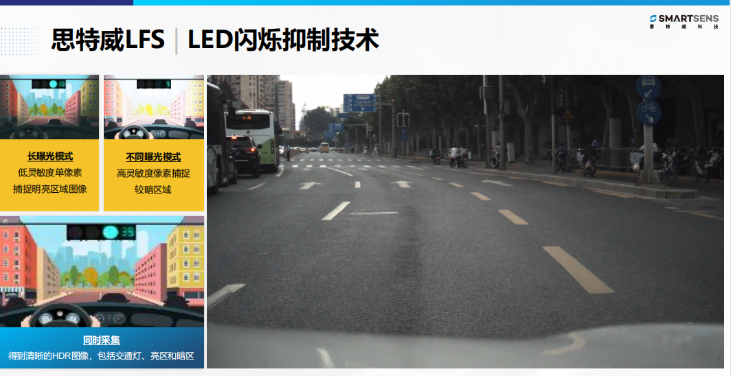 在车规传感器的技术创新上,思特威汽车芯片事业部副总裁邵科向媒体介绍了用于ADAS辅助驾驶的摄像头,思特威的LFS(LED闪烁抑制技术),解决智能驾驶的交通信号灯在不同光线环境下的清晰识别。