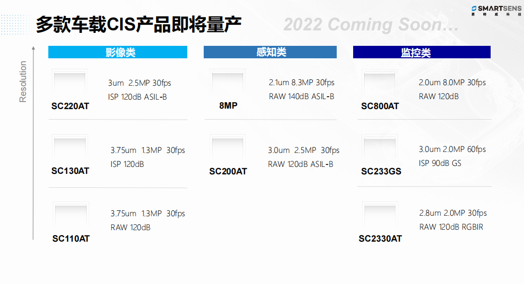 邵科还在发布会上透露了2022年的多款车载CIS量产产品的规格、细分应用市场。国内汽车市场体量巨大,未来肯定需要更多的供应商来服务客户。今年的缺货更是说明车规芯片供应商不能单一化。