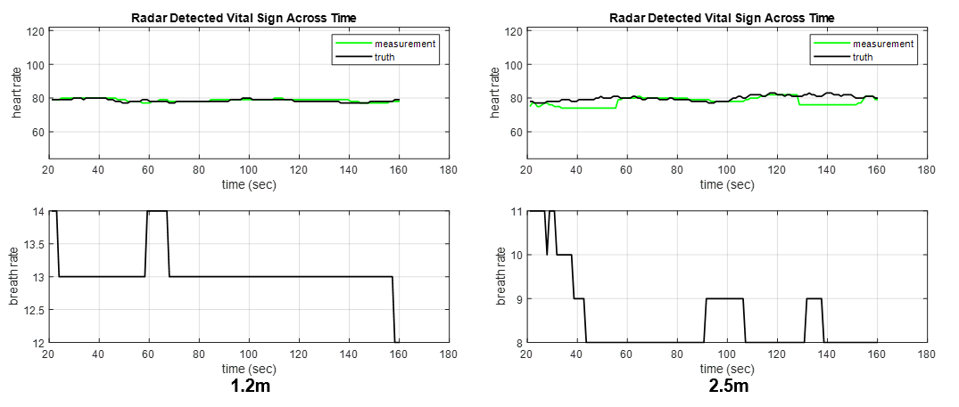图 3:使用安装在距离坐着的人 1.2 m 和 2.5 m 的胸部高度的 IWR6843AOP 传感器测量的心率和呼吸频率。