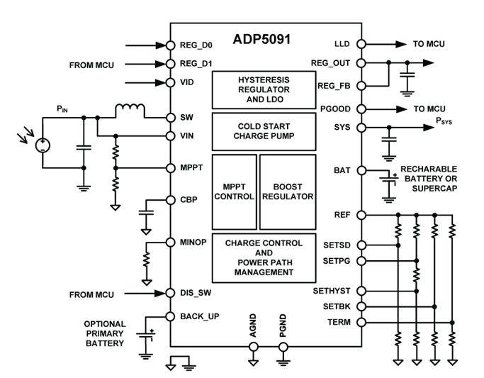 ADP5091是一款智能集成式能量采集纳米电源管理解决方案,可转换来自热电发生器(TEG)的直流电源。该芯片可以提供有限采集能量(从16 μW到600 mW范围)的高效转换,工作损耗为亚μW级别。 利用内部冷启动电路,调节器可在低至380 mV的输入电压下启动。 冷启动后,调节器便可在80 mV至3.3 V的输入电压范围内正常工作。