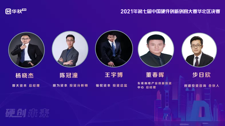 本次大赛特别邀请到了愉悦资本投资总监王宇博先生、顺为资本投资分析师陈冠潼先生、车库咖啡产业创新投资中心总经理董春晖先生、厚天资本总经理杨晓杰先生、创道投资咨询合伙人步日欣先生出席担任评委。