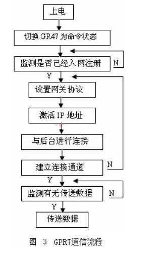 本系统采用了第二种方式获得本身 IP,而后台监控中心 服务器的IP 是固定的。采用GPRS 模块上网时,GPRS 模块 首先完成拨号登陆,然后进行数据传输。实现动态IP 方式 上网通信的处理流程如图3 所示。