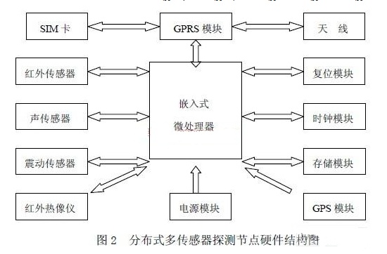 多传感器探测数据采集是指在探测节点运行的一个采集周期内,红外传感器、声传感器、 震动传感器等输出的AD 转换值。微处理器对采集的数据进行预处理,如果发现可疑的目标 信息,启动红外热像仪摄取目标图像,随后将采集的所有参量及图像数据传送到监控中心服 务器。