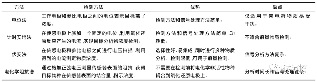 目前报道的汗液传感器检测原理主要为电化学方法及比色法。其中,电化学方法为通过制作有机或无机的选择性敏感膜材料,设计选择性电极,通过检测电极间电势差、电流、电阻信号,实现对汗液中生理标记物的选择性识别和检测。电化学原理的优势是灵敏度高、准确性好、制作工艺简单、体积小易集成。表1为汗液传感器电化学检测方法对比表。