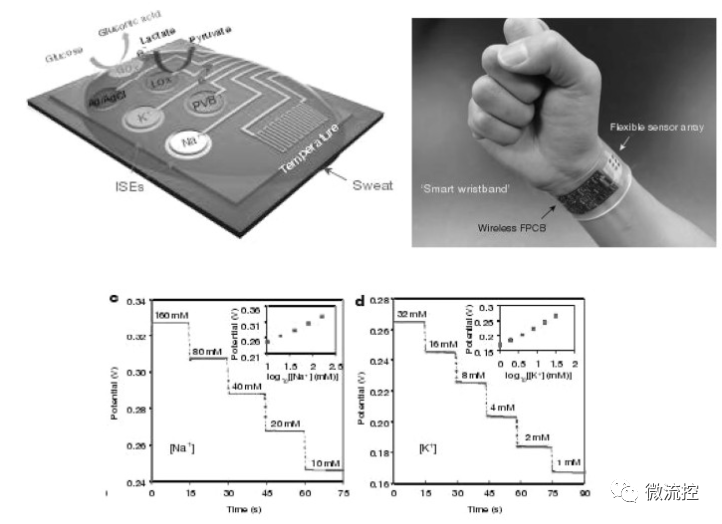 2016年,美国加州大学Wei Gao等鉴于汗液成分的复杂性,研究制作了多通道汗液传感器阵列,可同时检测多重目标生物标记物,进行原位汗液分析,检测目标包括汗液电解质(钠和钾离子)水平。检测采用电化学方法,制备具有生物选择性敏感电极,对汗液中的生理标记物进行选择性识别。通过采集电势差及电流变化,实现对待测目标的选择性检测,实现了检测限Na+(10~60)mmol/L、K+(1~32)mmol/L的指标。通过柔性敏感电极及柔性电路板的设计制作,实现汗液传感器的可穿戴。