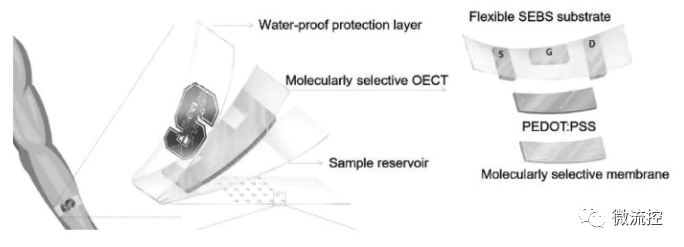 2018年,斯坦福大学Onur Parlak等基于分子选择纳米多孔膜制作了一种可穿戴有机电化学传感器用于皮质醇的无损检测。实验将一种电化学晶体管和特制的合成仿生高分子膜集成,这种膜作为分子记忆层,用于选择性地识别人类应激激素皮质醇。实验制作了带有微柱通道的汗液采集膜层,为传感器提供准确的汗液采集和精确的样本传输。该传感器已成功地应用于可穿戴传感器组件的人体真实样品分析。