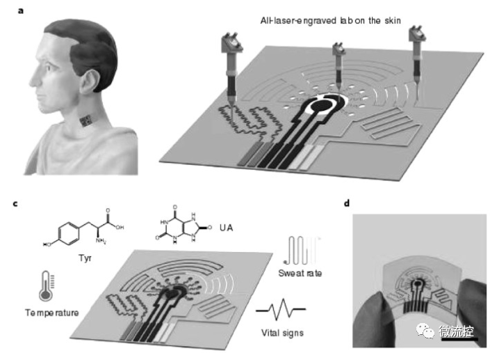 2019年,美国加州理工大学Yiran Yang等采用激光刻印技术制造了可穿戴汗液传感器,对汗液中尿酸和酪氨酸进行检测。研究通过检测食用富含嘌呤的膳食后患者和健康人汗液中尿酸水平,结果发现,痛风患者汗水尿酸水平高于健康人。尿酸和酪氨酸低检测限分别为0.74 μM和3.6 μM。