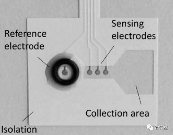 2016年,荷兰霍尔斯特研究中心V.A.T.Dam等研制出了一种廉价的一次性微型电化学传感平台,在聚对苯二甲酸乙二醇酯基片上制备了用于连续监测离子组成的汗液贴片。传感器包括一个汗液收集区,集成的参比电极以及用于实时监测汗液中氯化物浓度的丝网印刷AgCl电极阵列。