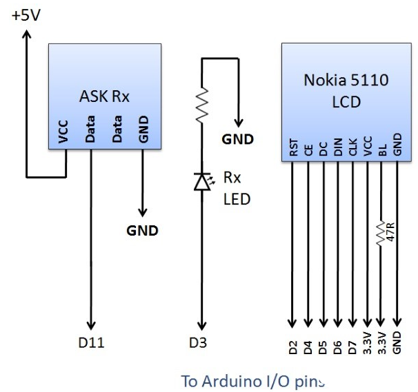 接收模块同样包含VCC、Gnd和Data三个引脚。某些模块可能具有多个数据引脚。在这种情况下,您可以使用它们中的任何一个,因为它们都连接在一起。在接收端,Rx模块的数据引脚输出,并由Arduino引脚读取。在本文中,它连接到Arduino的D11引脚。与发送端类似,连接到D3引脚的LED指示接收发送器发送的数据。诺基亚5110 LCD也连接到接收端Arduino,以显示远程站的温度和湿度。在本文中,我在接收端使用Crowduino Uno。请注意,诺基亚5110 LCD的工作电压为3.3V。如果您的Arduino开发板工作在5.0V,则在Arduino和LCD之间需要一个电压转换器。下图更详细地显示了接收端的连接。