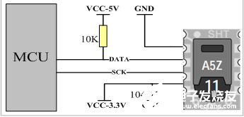 SHT10的供电电压范围为2.4-2.5V,为保证传感器的最高精度,建议供电电压为3.3V。在电源引脚(VDD,GND)之间须加一个100nF的电容,用于去耦滤波。另外,为避免信号冲突,微处理器应驱动DATA在低电平,这是需要一个外部的上拉电阻(1-10K)将信号提拉至高电平。SHT10的典型应用电路如图3-8所示: