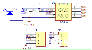 在图3-10中,P1和P2是两个排针,用于SHT10模块与底板的接口连接,另外在SHT10模块上添加了一个工作指示灯DS,便于直观的观测到SHT10传感器的电源是否正常。