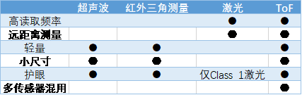 在测距上,ToF与传统的超声波、红外三角测量、激光相比有着不小优势。不仅支持高读取频率和远距离测量,同样可以确保眼部保护以及多个传感器的混用,更重要的是不受环境光的影响。