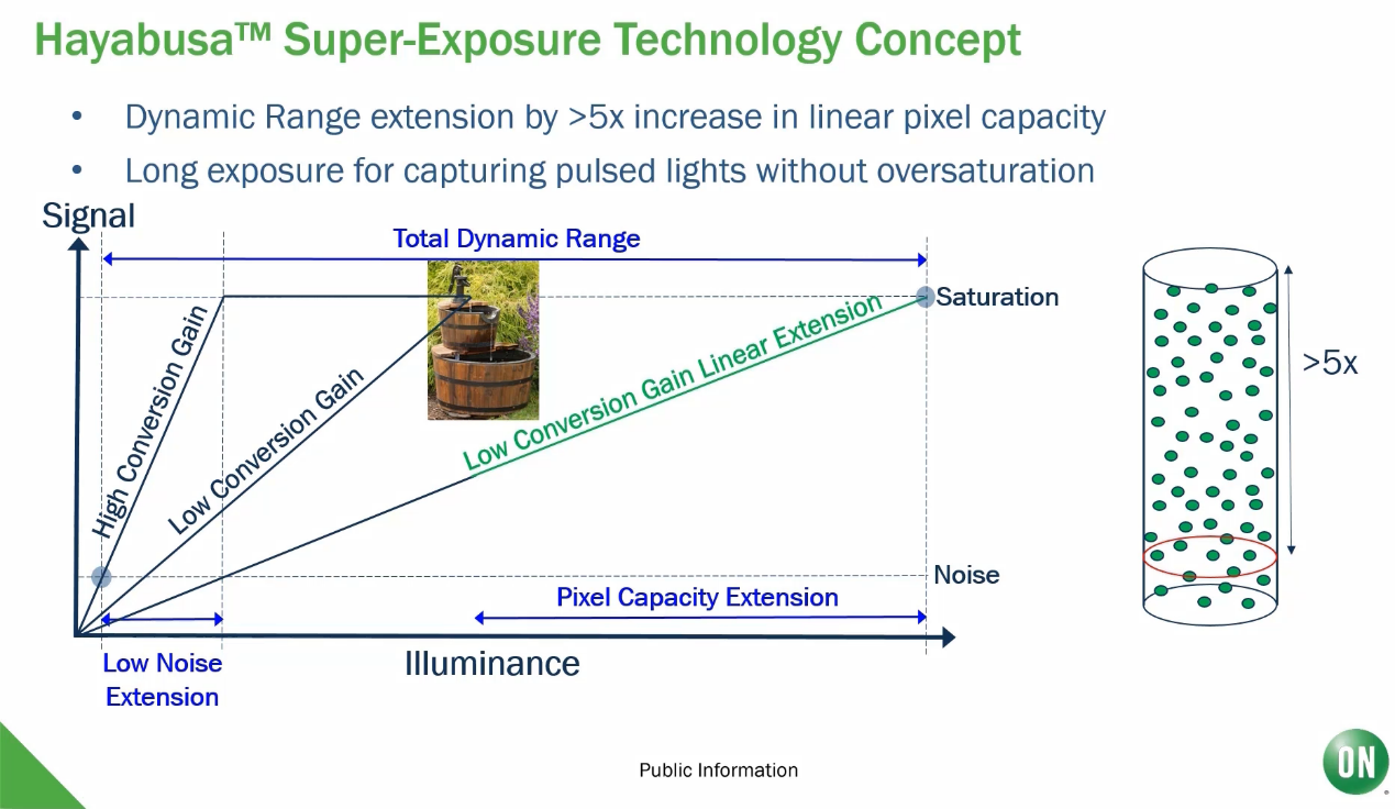 在去年的AutoSens展会上,安森美推出了针对汽车摄像机视觉系统的Hayabusa CMOS传感器。该CIS采用了超曝光技术,实现了LED闪烁抑制(LFM)和高动态范围成像(HDR)。在汽车使用场景中,前照灯,尾灯等都会用到LED脉冲节省能源,但这种光线场景中,需要使用短曝光时间才能避免明亮部分过度饱和。但这样做又会捕捉到光源熄灭的画面,这种闪烁对驾驶员和辅助驾驶系统的判断都会造成影响。超曝光技术可以提高5倍以上的像素容量,从而扩展了高亮度下的动态范围,于是可以用更长的曝光时间来捕捉光源,而不会产生过度饱和。