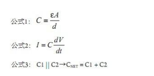 为了更好地理解在电容触摸传感">电容触摸传感应用的硬件、布线和软件开发中需要采取哪些措施,了解它内在的物理性质非常重要。控制它的是两个基本公式和一个常识。第一个公式(见公式1)用于求电容值,它说明如何根据极板模型使用面积、距离和材料属性来定义电容。第二个公式(见公式2)说明电容电压与电流的关系,并引入RC电路的充电速率(等于时间常数τ)。第三个公式(见公式3)说明并联电容的总电容值等于两者相加。
