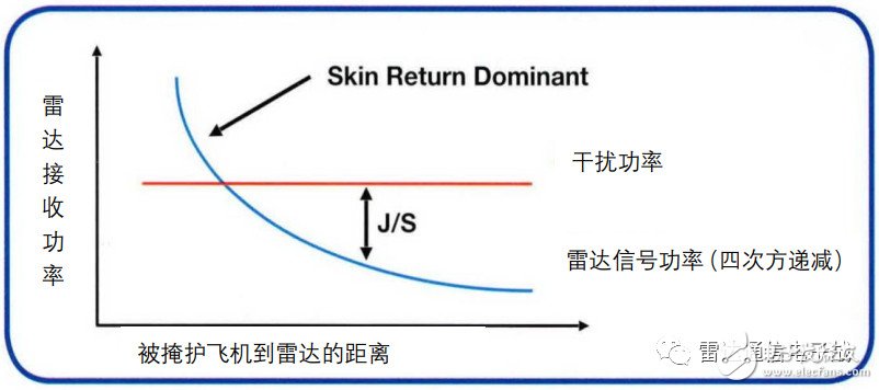 注意,图中的蓝色曲线(接收到的skin return power)是雷达到目标距离的四次方的函数,而红线(接收到的jammer power)保持不变。随着距离目标的距离减小,J/S减小。