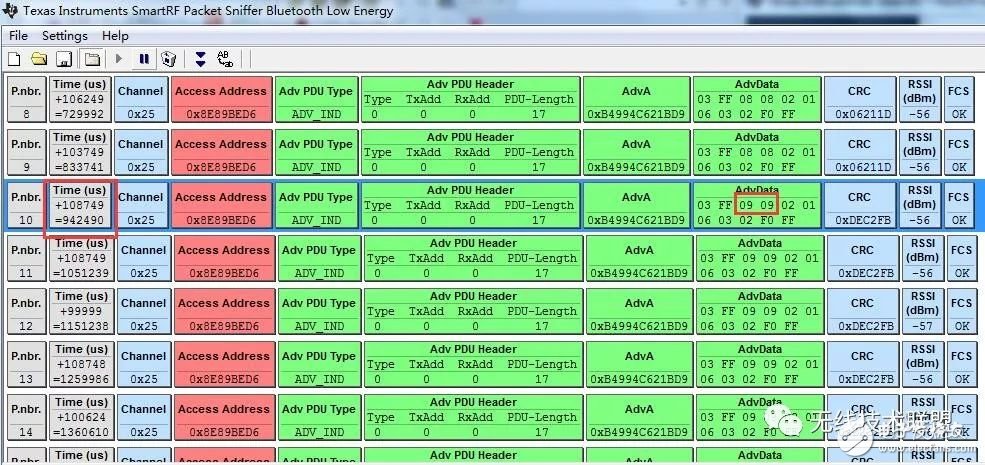 下图为CC2540 BLE抓包工具抓包的截图,右边AdvData内的数据即为广播数据,该广播数据由工程师自己设计,最大支持的字节为31个直接,两横条之间Time的差值即为广播间隔。