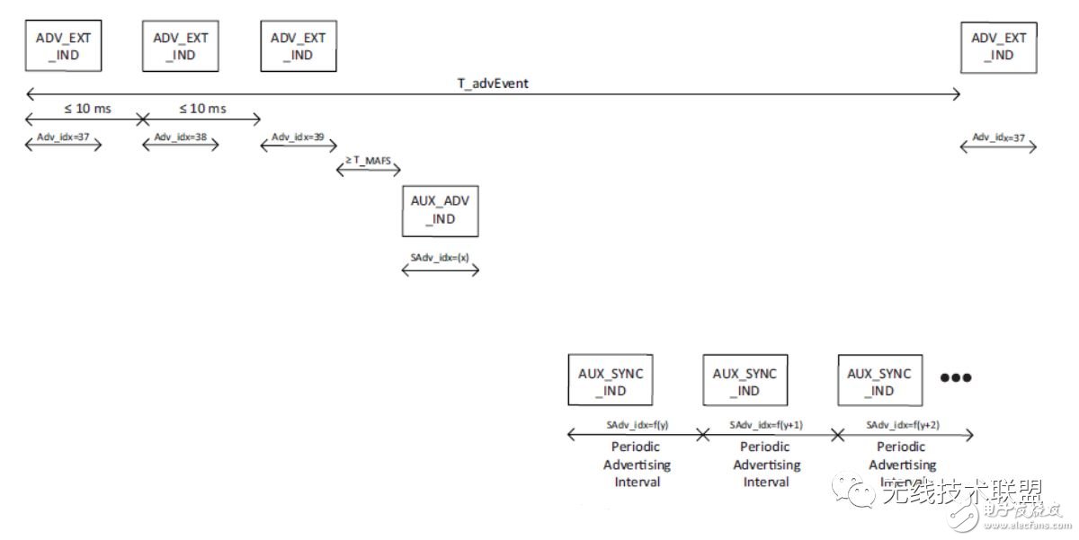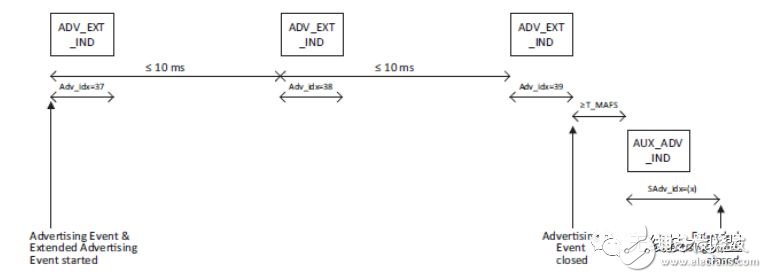 主广播信道只工作在37,38,39三个信道,最大广播字节为31字节,广播的数据类型增加了一个ADV_EXT_IND指令,ADV_EXT_IND指令即为告知监听设备,我要广播大数据包广播了。
