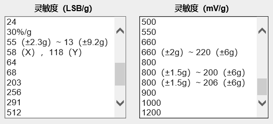 灵敏度(LSB/g)主要针对数字输出加速度传感器,代表一个重力加速度(g)下,输出能区分多少位LSB。上面已经根据应用要求推导出,假设应用要求最小分辨率为1°,灵敏度需要大于58LSB/g。那么可以根据这一结果直接在参数栏里选择。