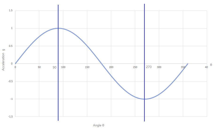 如下图,当角度在90°到270°,单轴加速度传感器输出值Ax与角度一一对应,超过这个范围,每个输出值Ax在360°范围内,对应两个倾斜角度,无法有效的区分。