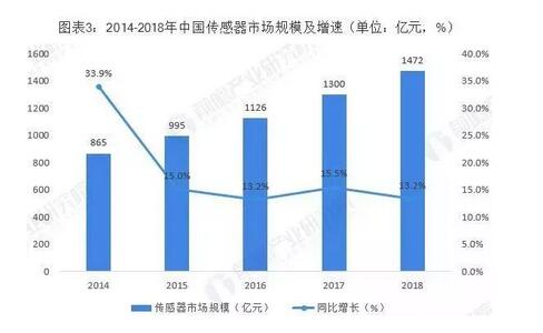 麦肯锡报告指出,到2025年,物联网带来的经济效益将在2.7万亿到6.2万亿美元之间,其中传感器作为物联网技术最重要的数据采集入口,将迎来广阔的发展空间。据中国信通院数据显示,近年来中国传感器市场规模保持较快增长,2018年达到1472亿元,同比增长13.2%,近5年均保持两位数的增长率。