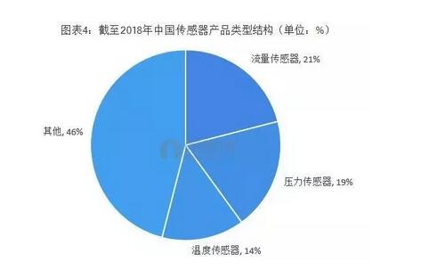 根据传感器类型不同,具体包括温度和湿度传感器、压力传感器、图像传感器、光传感器、位置传感器、重力传感器等。流量传感器、压力传感器、温度传感器占据最大的市场份额。