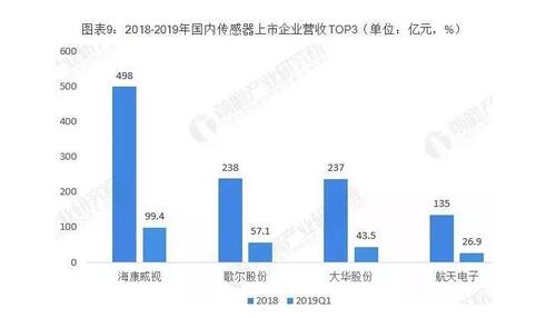 我国的传感器市场增长迅速,年均增长速度超过10%,据统计,2018年国内的传感器市场规模达到1472亿元。2018年国内传感器上市企业整体的营收增长明显,八成以上的企业营收都出现增加,仅有三家企业(歌尔股份(002241)、晶方科技(603005)、科陆电子(002121))出现负增长。其中歌儿股份营收下滑的原因是智能手机增速放缓和VR产品销售未达预期,导致传感器业绩不理想;晶方科技的传统传感器产品面临的激烈市场竞争导致价格战,同时它们加大了应用在汽车电子上MEMS智能传感器的投入放缓了营收增长率。